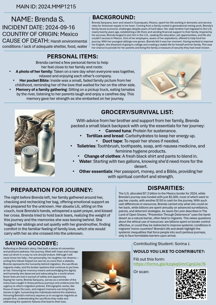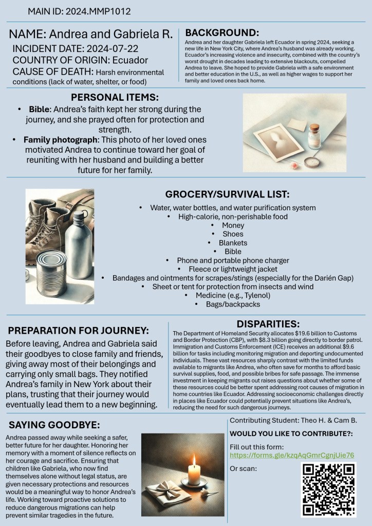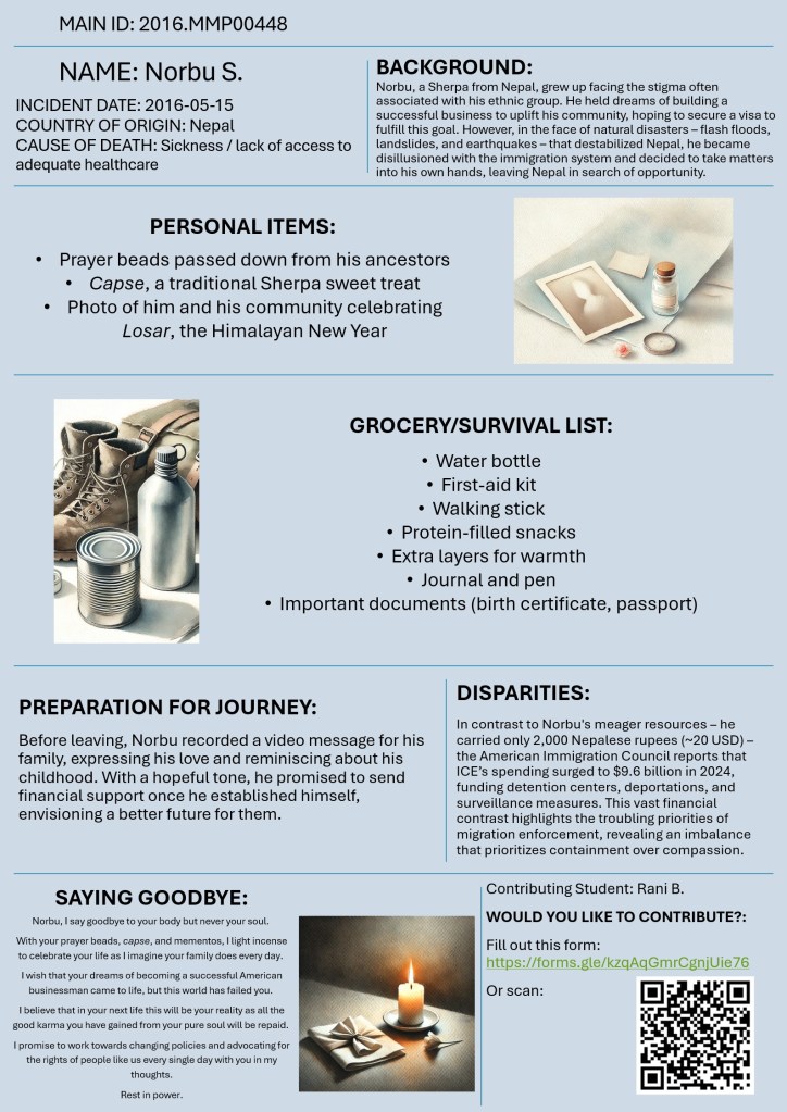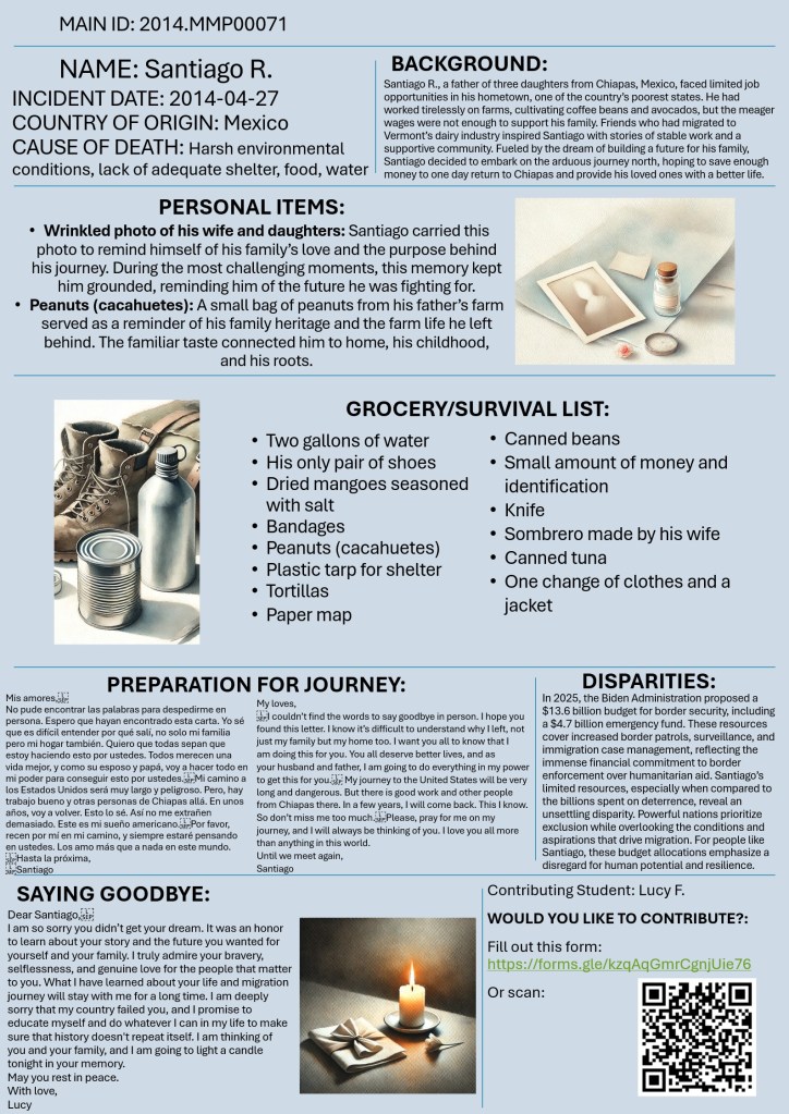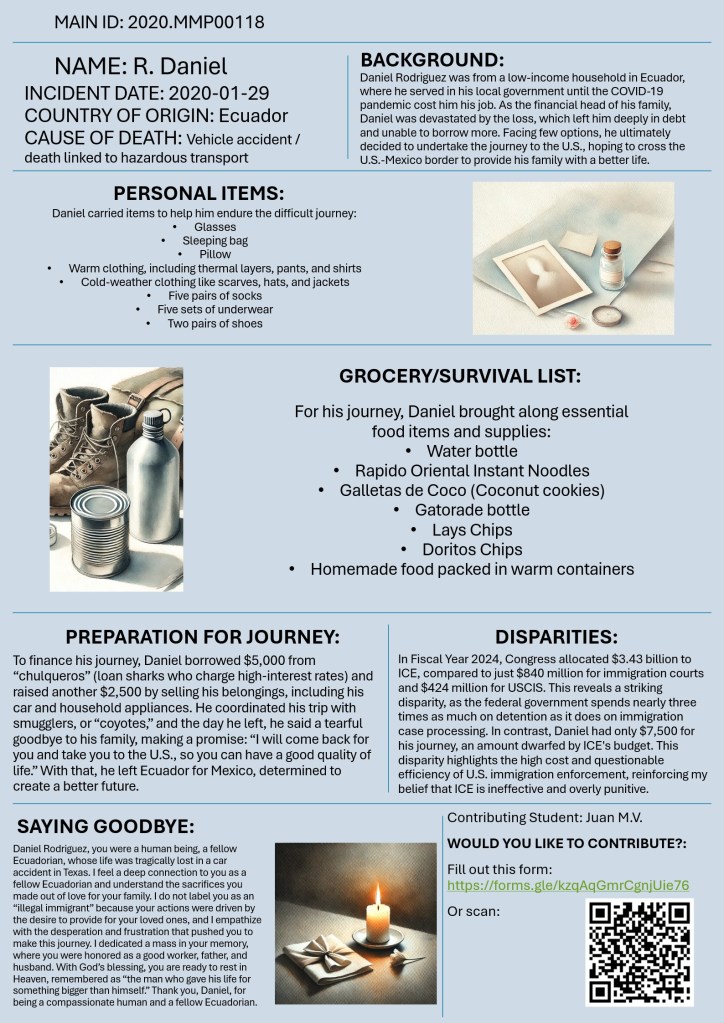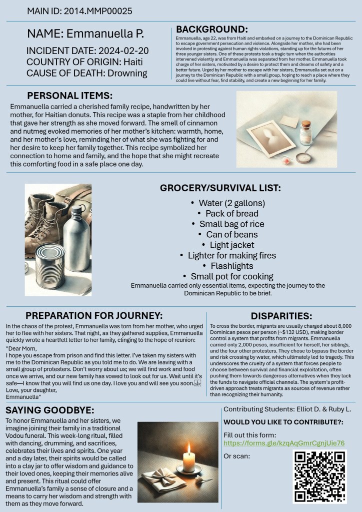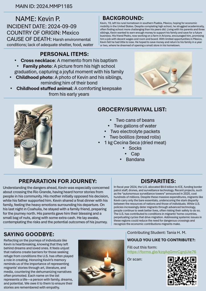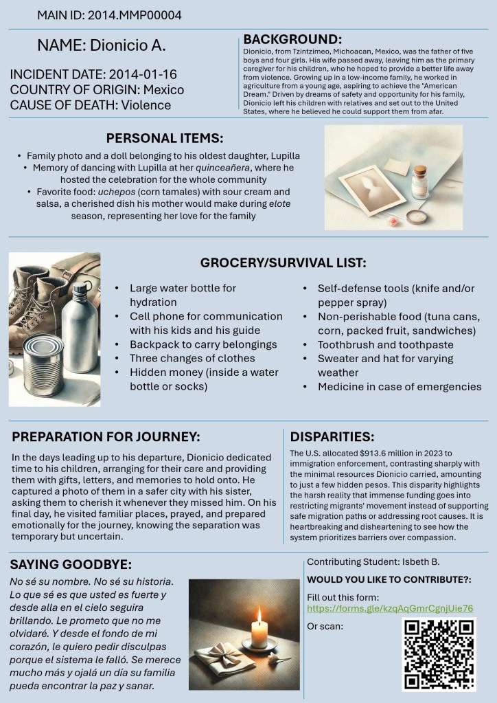 Would you like to contribute? Please fill out this form. Each form submission will help us create a new, unique poster dedicated to honoring and remembering these individuals. Your reflections help transform numbers into stories, making each migrant’s memory visible and human.
