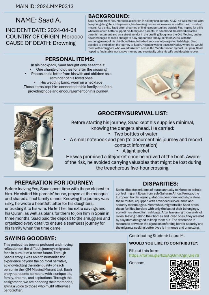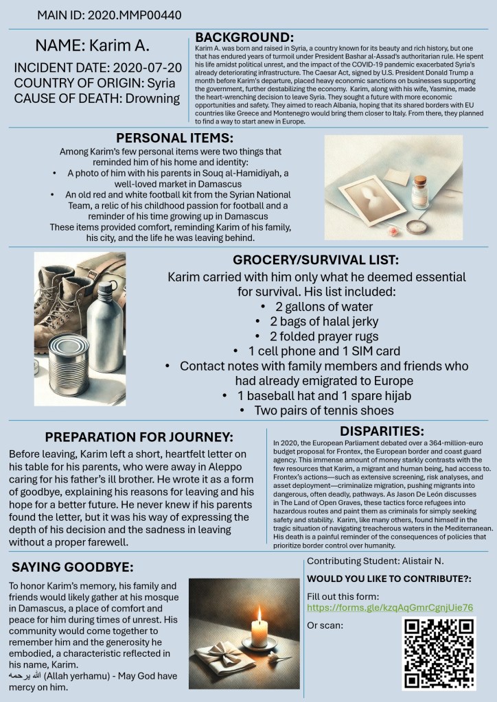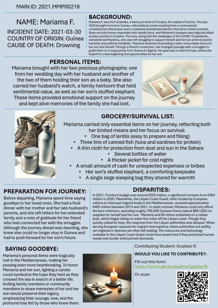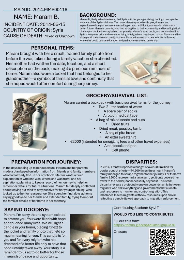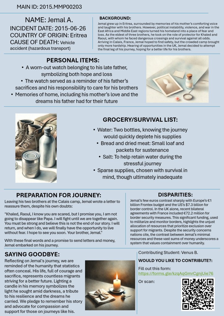 Welcome to “Missing Migrants beyond Numbers”! This initiative invites you to look beyond statistics and confront the human realities behind migrant journeys, shifting away from narratives that reduce migrants to numbers, legal status, or security concerns. Drawing from the “Missing Migrants” data from the International Organization for Migration (IOM), students were asked to reimagine the lives of those who have gone missing or lost their lives while crossing borders. This exercise aims to honor the dignity and humanity of migrants by exploring the personal stories, dreams, and daily struggles that are often obscured by policy and media.