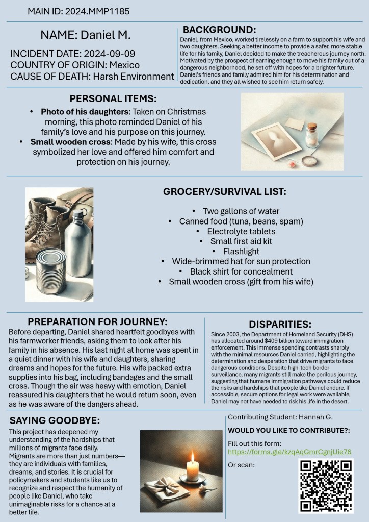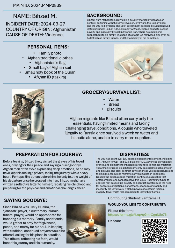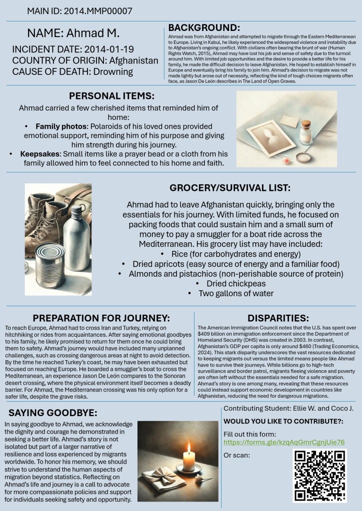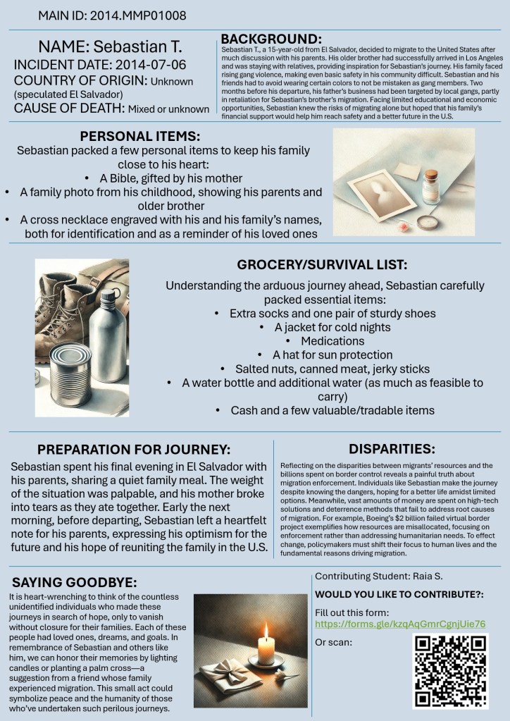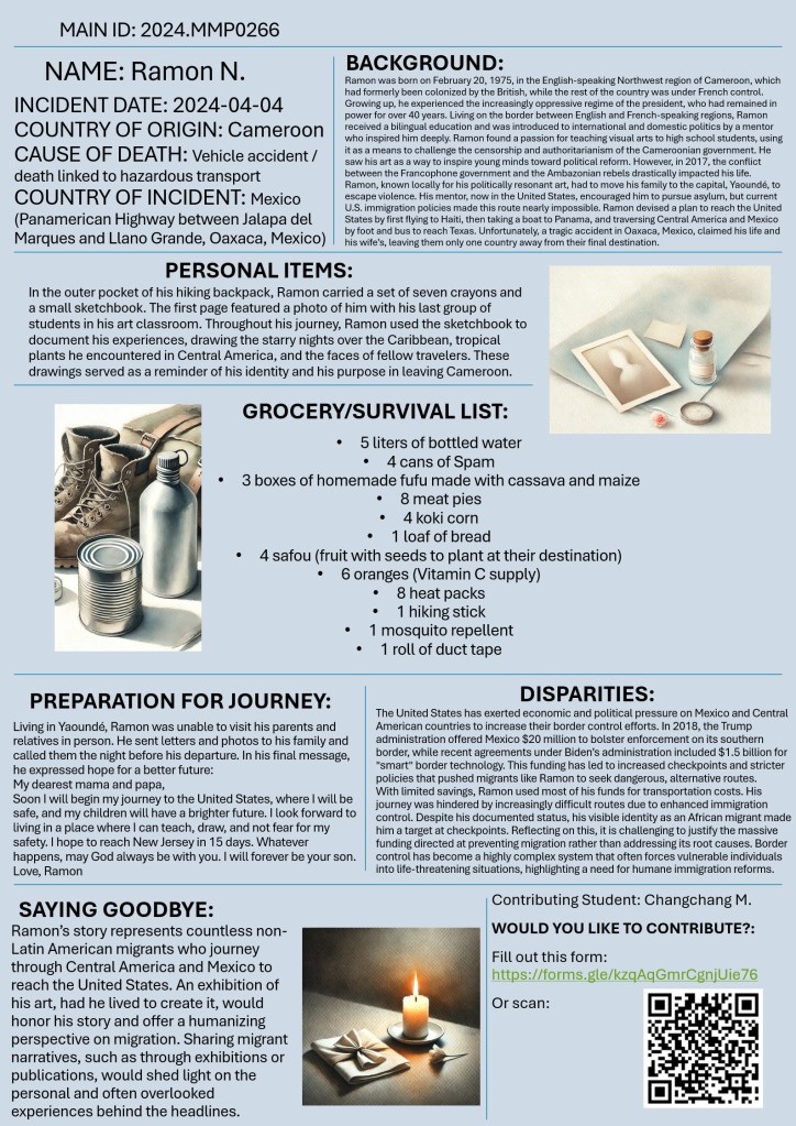 Welcome to “Missing Migrants beyond Numbers”! This initiative invites you to look beyond statistics and confront the human realities behind migrant journeys, shifting away from narratives that reduce migrants to numbers, legal status, or security concerns. Drawing from the “Missing Migrants” data from the International Organization for Migration (IOM), students were asked to reimagine the lives of those who have gone missing or lost their lives while crossing borders. This exercise aims to honor the dignity and humanity of migrants by exploring the personal stories, dreams, and daily struggles that are often obscured by policy and media.
